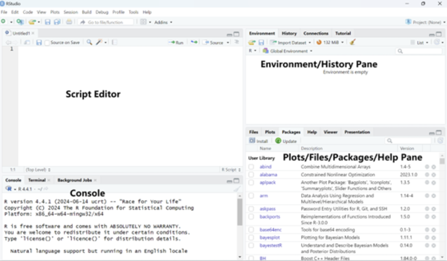 Plots/Files/Packages/Help Pane (bottom-right): This area has multiple tabs. You can see your graphs (plots), manage your files, install and view tools (packages) that help you with your analysis, and get help when you need it.