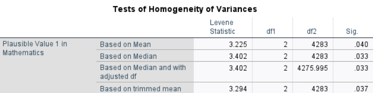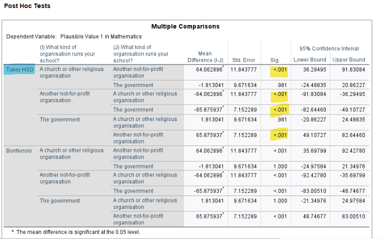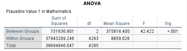 Interpretation: The one-way ANOVA showed a statistically significant difference in mean math scores (PV1MATH) among the three school types (\(F(2,4283) = 42.42, p<.001\)). This means that at least one school type has a mean math score that differs significantly from the others.