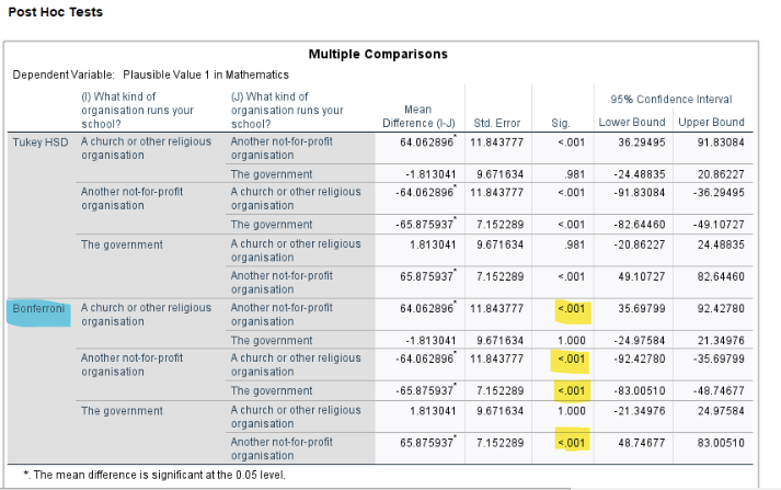 The Bonferroni-adjusted pairwise t-tests indicate that students in non-profit schools have significantly different mean math scores compared to both government (\(p < .001\)) and religious schools (\(p < .001\)), while government and religious schools do not significantly differ from each other (\(p = 1\)).