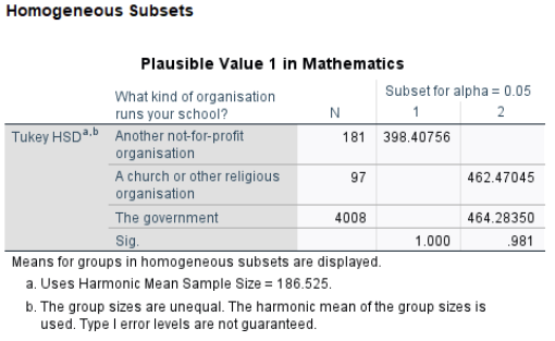 Tukey’s HSD homogeneous subsets further reinforce this finding, showing that the “Another not-for-profit” group forms its own subset with a significantly lower mean, whereas the “Church/Religious” and “Government” schools form a higher subset and do not differ significantly from each other.