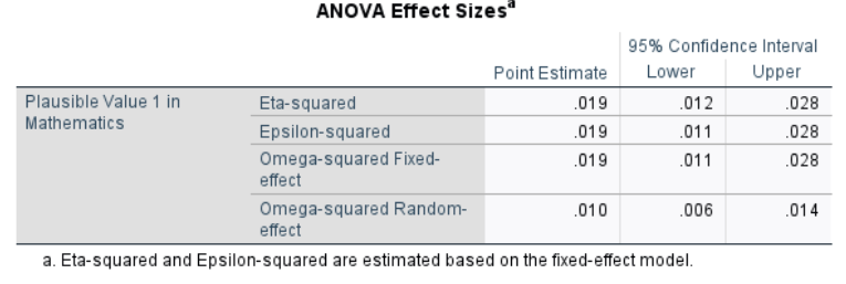 Both the \(\eta^2\) and \(\omega^2\) values are 0.02, meaning that about 2% of the variance in math scores is explained by school type. According to common benchmarks, this represents a small effect size. This suggests that other factors, beyond school type, account for most of the differences in performance.