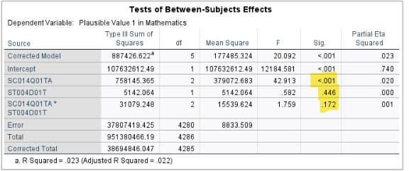 Before conducting any analysis, we first remove cases with missing values on any variables that will be used. In this example, the variables are PV1MATH, SC014Q01TA, and ST004D01T. Steps: