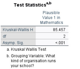 The Kruskal-Wallis test consistently shows a significant difference in math scores (PV1MATH) among at least one pair of the school types (\(\eta^2 = 85.46, \, p < 0.05\)).