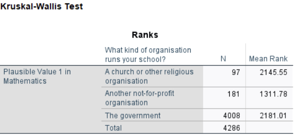The Kruskal-Wallis test consistently shows a significant difference in math scores (PV1MATH) among at least one pair of the school types (\(\chi^2 = 85.46, p < 0.05\)). Looking at the mean ranks, non-profit schools have the lowest math scores (mean rank ≈ 1312). Government and religious schools have higher and similar mean ranks (≈ 2181 and 2146). The Kruskal-Wallis test does not specify which pairs of school types differ. To determine this, post hoc tests such as Dunn-Bonferroni are required. SPSS’s standard Kruskal-Wallis procedure does not provide these post hoc comparisons, so you would need to use R, Python, or other software to perform them.