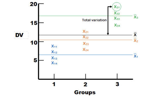 Next, we can see the distance between individual \(X_31\)’s score on the dependent variable and the mean for Group 3. This is the distance \(X_31\) contributes to the variation within groups, or the error variance. Error variance in ANOVA refers to the variation in the dependent variable that cannot be explained by the independent variable(s). It represents the variability within groups or conditions, which arises from random differences among individual observations rather than systematic differences between groups. We square that distance for each observation in each group and add them up to get the Sum of Squares (Error).