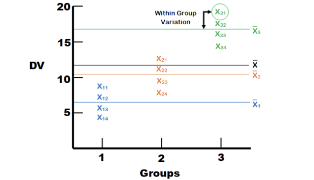 How does an ANOVA work? There is a clue in the name – analysis of variance. With ANOVA, we are comparing the variance in a dependent variable that is due to differences between groups to the variance due to differences within each group. There will always be some differences within groups because people are different in ways unrelated to the groups they are in. The key with an ANOVA is to find out how much of the total difference (or variance) in the dependent variable is due to people being in different groups, as opposed to people just being different from each other. We will go through an example to explain, but this video provides a good visualization of the concepts.