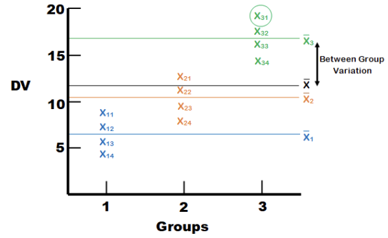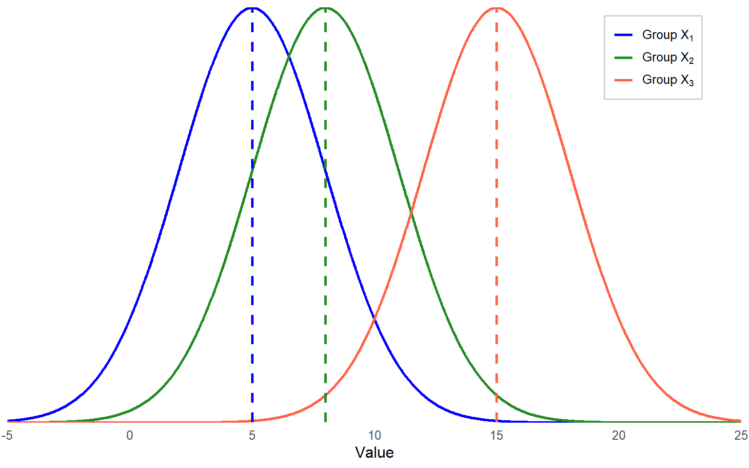 Figure 10.1 provides a visual that may help. Imagine we have three groups, X1, X2, and X3. Each group has its own distribution of scores on the dependent variable, with its own mean and variance/standard deviation. If individual differences within the groups are large, then it is hard to make a conclusion about between-group differences by comparing means, because the group distributions may overlap.