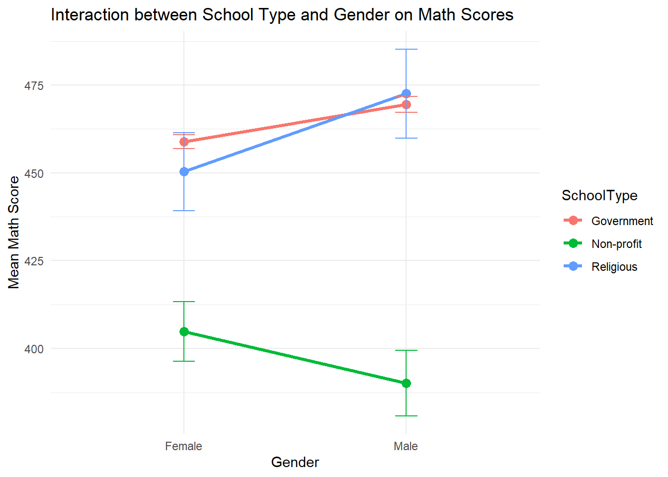 Interpretation: The two-way ANOVA results show a significant main effect of school type (\(F(2, 4280) = 42.91, p < .001\)), indicating that mean math scores differ significantly among the three school types (Government, Non-profit, Religious). In contrast, the main effect of gender is not significant (\(F(1, 4280) = 0.58, p = .446\)), suggesting that male and female students do not have statistically different average math scores.