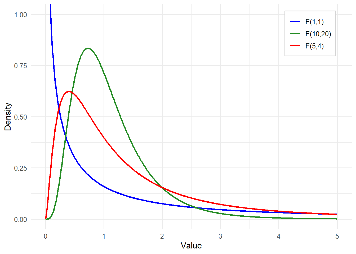 Unlike a t test which uses a t statistic and follows the t distribution, an ANOVA uses the F statistic and follows the F distribution. A t test compares means, which can be positive or negative. However, variance is either positive or zero, so the F distribution looks quite different from the t distribution. And actually, there are multiple F distributions. Just like the t distribution changes with the degrees of freedom (higher degrees of freedom means the distribution becomes closer and closer to normal), the F distribution also changes based on degrees of freedom. This time, however, we have two separate degrees of freedom. Some examples are shown in Figure 10.2.