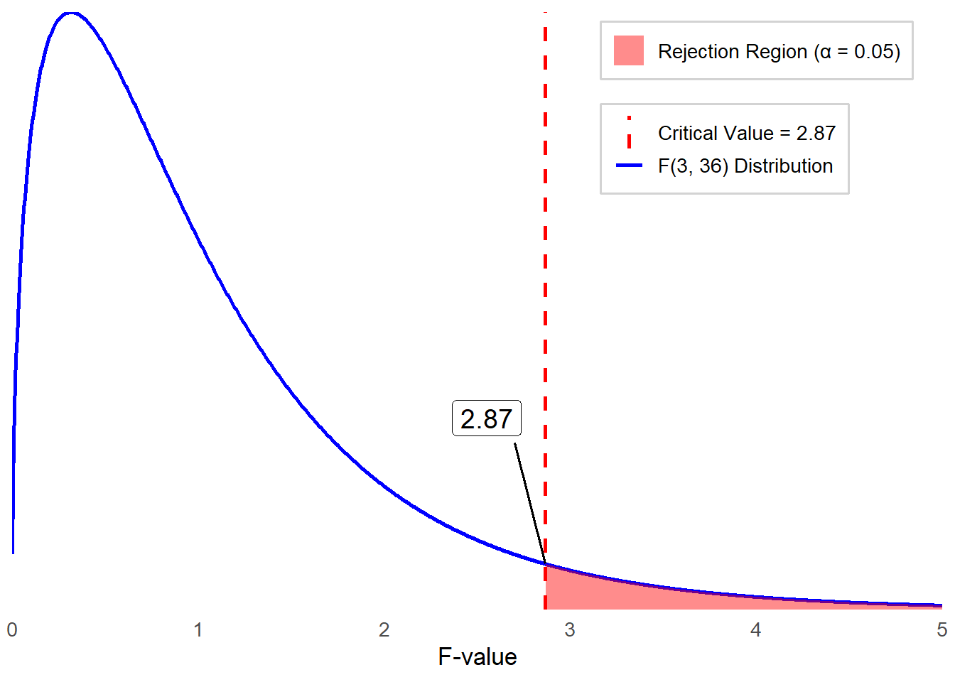 Let’s set \(α = 0.05\) as our criteria for decision as usual. Remember, ANOVA uses the F distribution, which is defined by two separate degrees of freedom for the sampling distribution of the test statistic, \(F = \frac{MS_{BG}}{MS_E}\). The degrees of freedom for between-group variation are \(df_{BG} = k - 1\). The degrees of freedom for within-group (error) variation are \(df_E = N - k\). In this example, \(k = 4\) and \(N = 40\). Thus, the sampling distribution of F follows an F distribution with (\(df_{BG}\), \(df_E\)) = (3, 36).