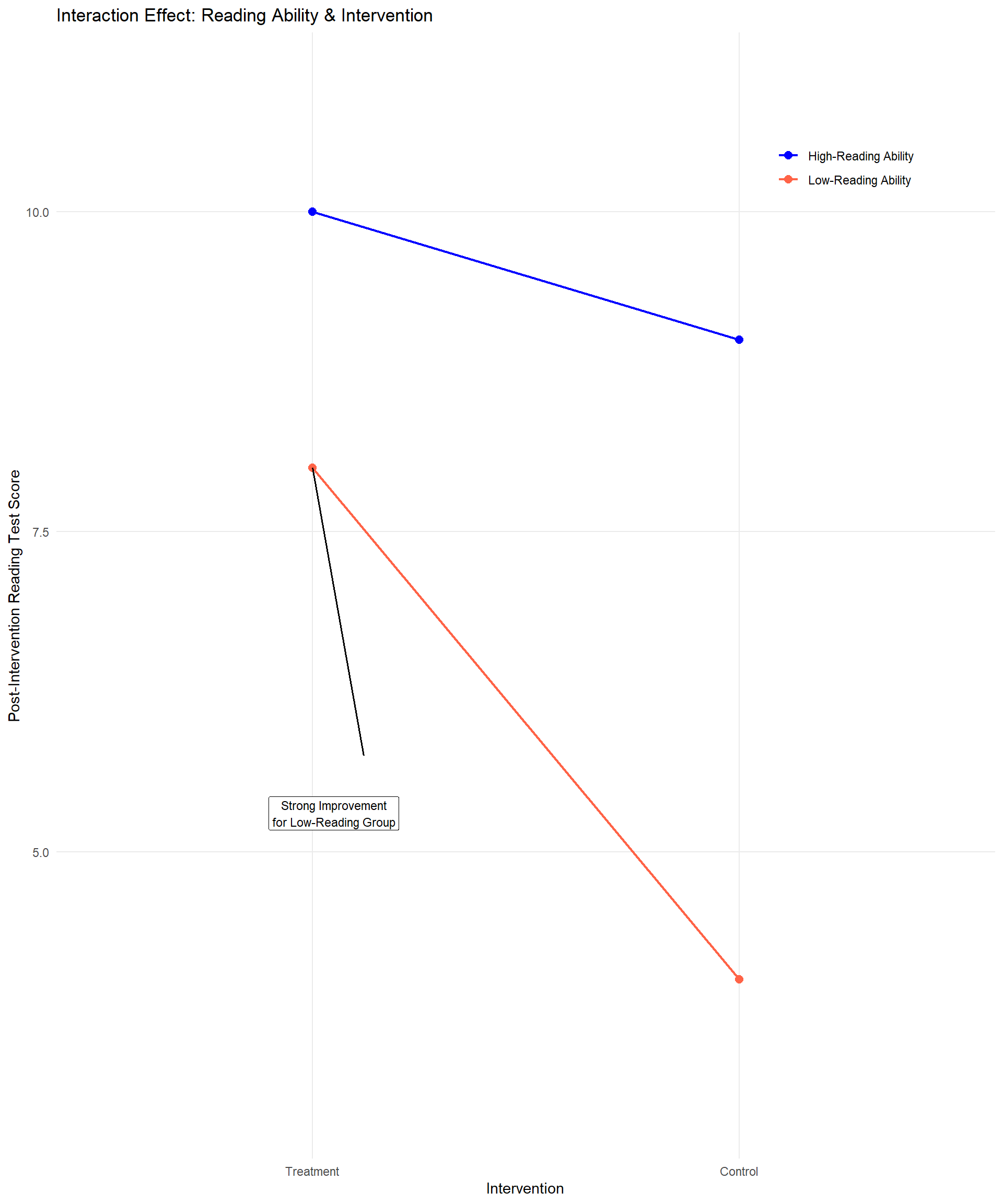 Factorial ANOVA identifies interaction effects. A two-way factorial ANOVA helps researchers examine how multiple independent variables interact to influence an educational outcome. This is particularly useful in evaluating whether interventions work differently for different groups (e.g., high- vs. low-achieving students).