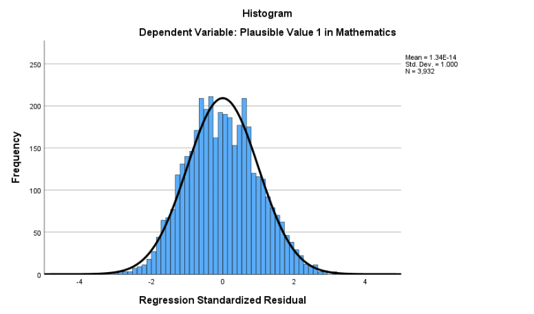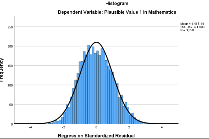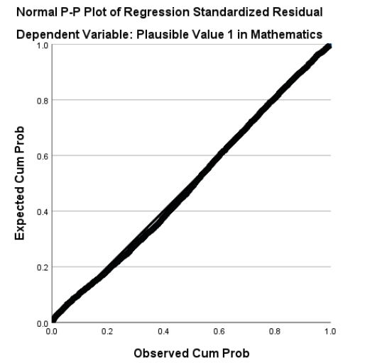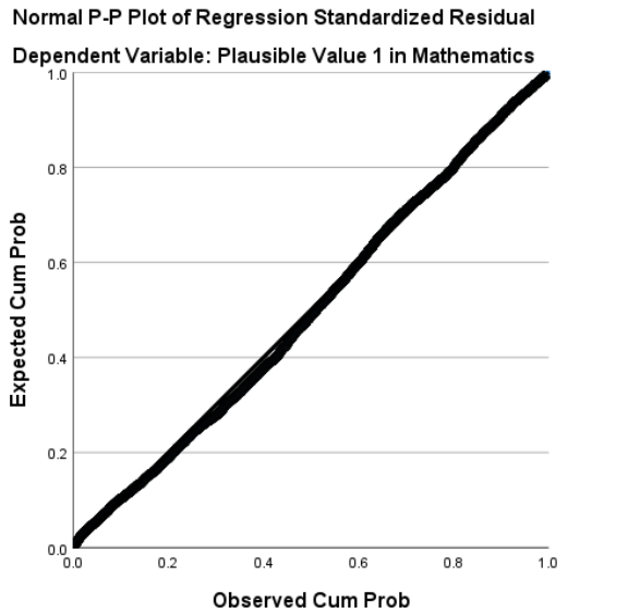 In the Normal P-P Plot, points follow the diagonal closely, confirming residuals are roughly normal. We can also see Standardized residuals all fall within \(\pm3\), suggesting no highly influential outliers.