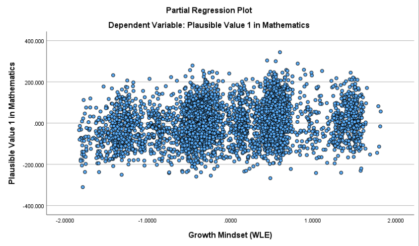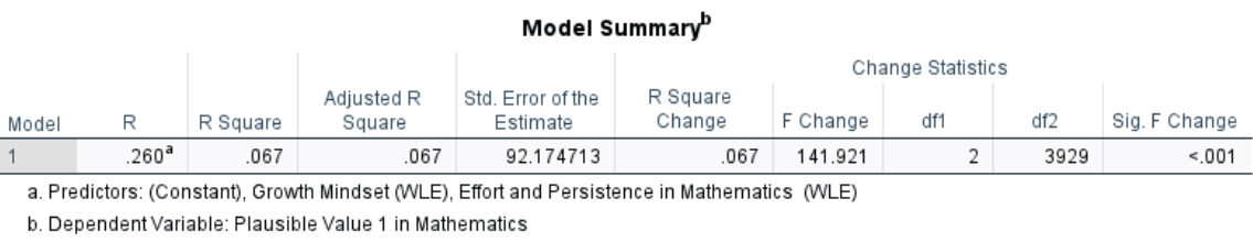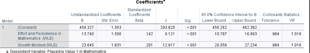 The multiple linear regression show that both predictors have significant positive effects on math achievement: for each one point increase in effort and persistence, math scores increased by about 13.74 points ($b=13.74, ,SE=1.51, ,p<.01 \(), and for each one standard deviation increase in growth mindset, scores increased by about 23.65 points (\)b=23.65,, SE=1.83,, p<.01\(). The model explained approximately 6.7% of the variance in math achievement scores (\)R^2=.067$), with a residual standard error of 92.17.