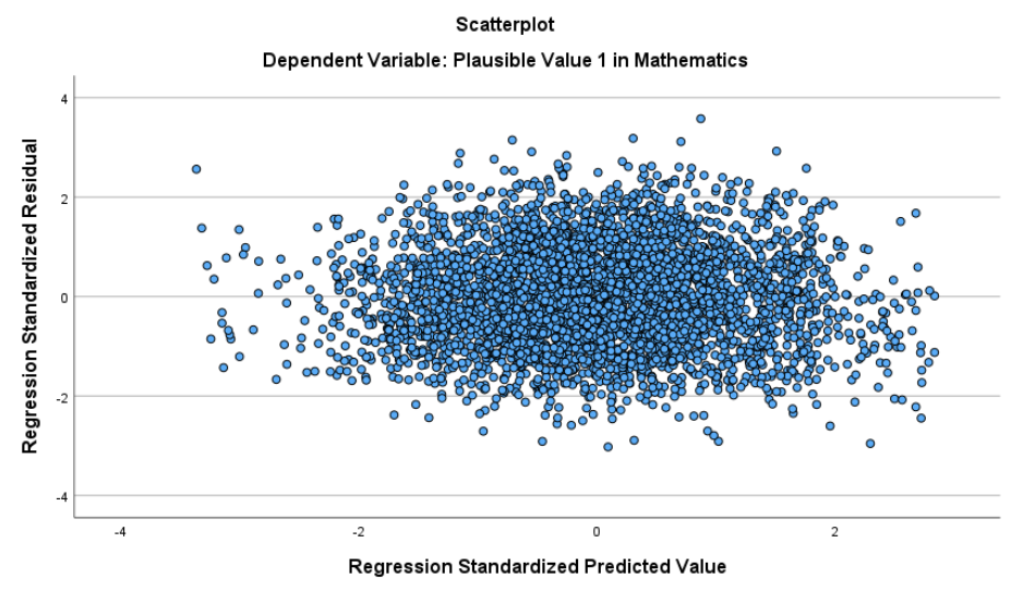 In the Scatterplot of Standardized Residuals vs. Predicted Values, the residuals are randomly scattered without a clear funnel pattern, suggesting that the assumptions of linearity and homoscedasticity are basically satisfied.