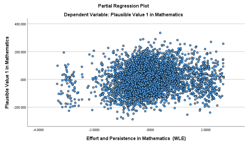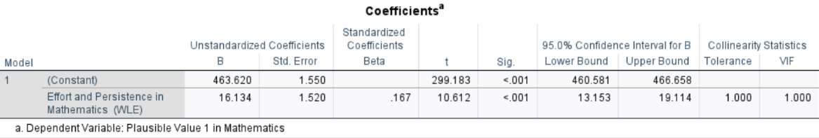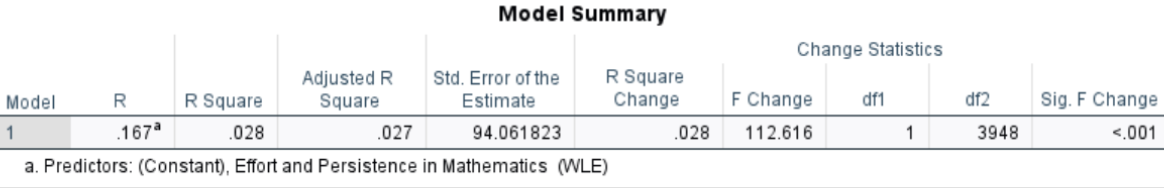 Interpretation: The regression analysis found a significant positive relationship: for each one point increase in effort and persistence, math achievement scores increased by approximately 16.13 points (\(b=16.13, \,SE=1.52,\, t=10.61,\, p<.05,\, 95\% \, CI [13.15, 19.11]\)).The model explained about 2.8% of the variance in math achievement ( \(R^2 = .028\)). The residual standard error was 94.06, indicating that, on average, students’ actual math scores deviated from the predicted scores by about 94 points. Although the effect size is modest, the result suggests that students who put in more effort and persist in mathematics tend to score higher on the PISA math achievement test.