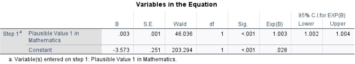 A logistic regression was conducted to examine whether students’ math scores predict the likelihood that they perceive mathematics as easier than other subjects. The results show a significant positive effect of math score (\(b=0.003, \, SE=0.001, \, Wald \, \eta^2²=46.036, \,p<.01\)). This means that for each point increase in the math score, the odds of perceiving math as easier increase by 0.3% (odds ratio: \(e^{0.003} = 1.003\)). In other words, higher math achievement is associated with a slightly higher probability of perceiving math as easier than other subjects.