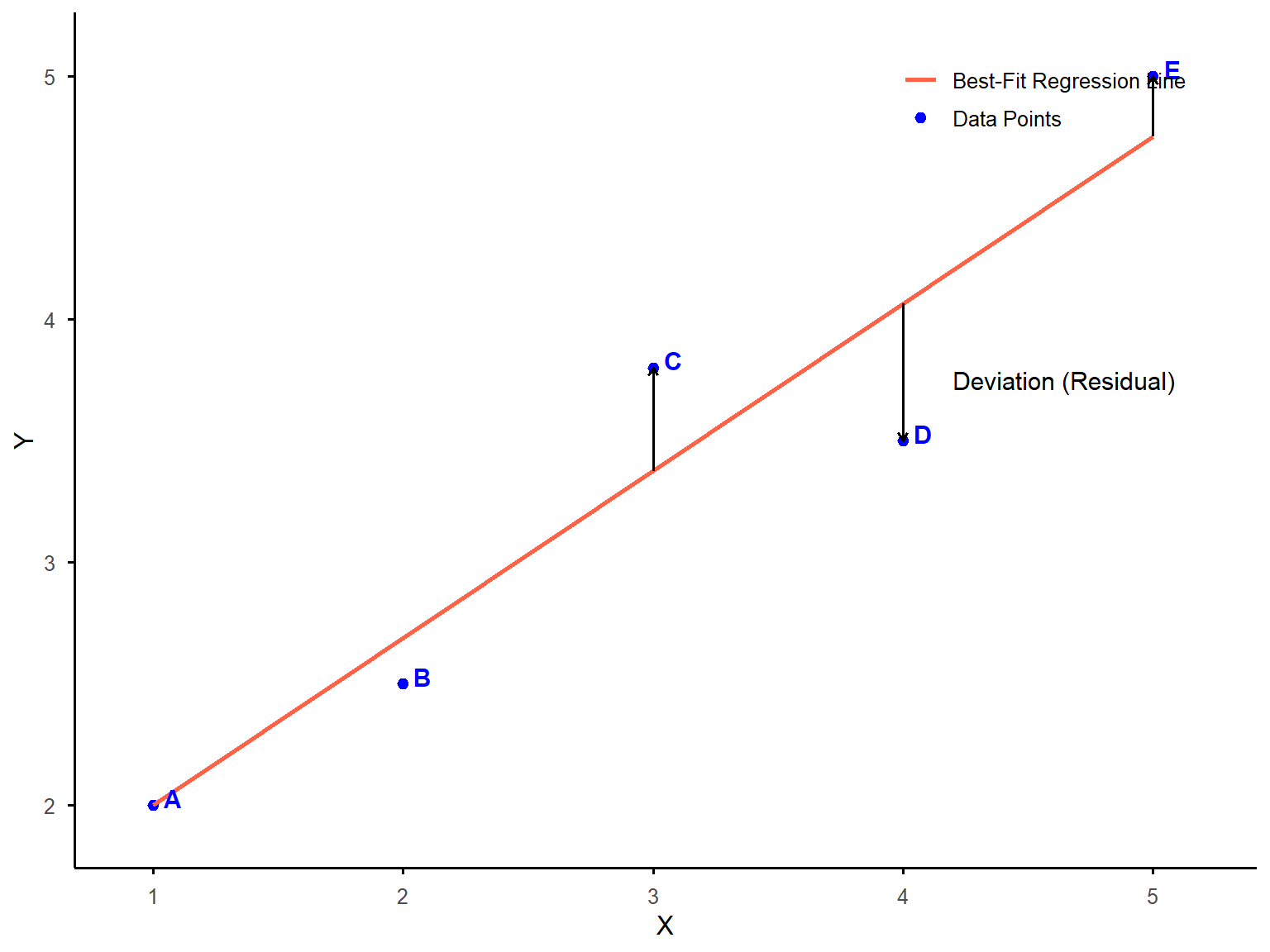 Suppose that we measure two variables, one predictor or independent variable plotted on the X-axis, and one criterion or dependent variable plotted on the Y-axis. Figure 12.1 shows a scatterplot with five data points (A, B, C, D, and E) along with the line of best fit. The arrow from each data point to the line represents the distance from each data point to the best-fitting line. As you see, all data points deviate from the line to some extent. Data point D (below the line) has the largest deviation from the line and A (above the line) has the smallest. To quantify these deviations, we square each distance to ensure all values are positive. The sum of squares (SS) in this example is the total of these squared deviations across all five data points. The regression line is defined as the one that minimizes this sum, providing the best possible fit to the data.
