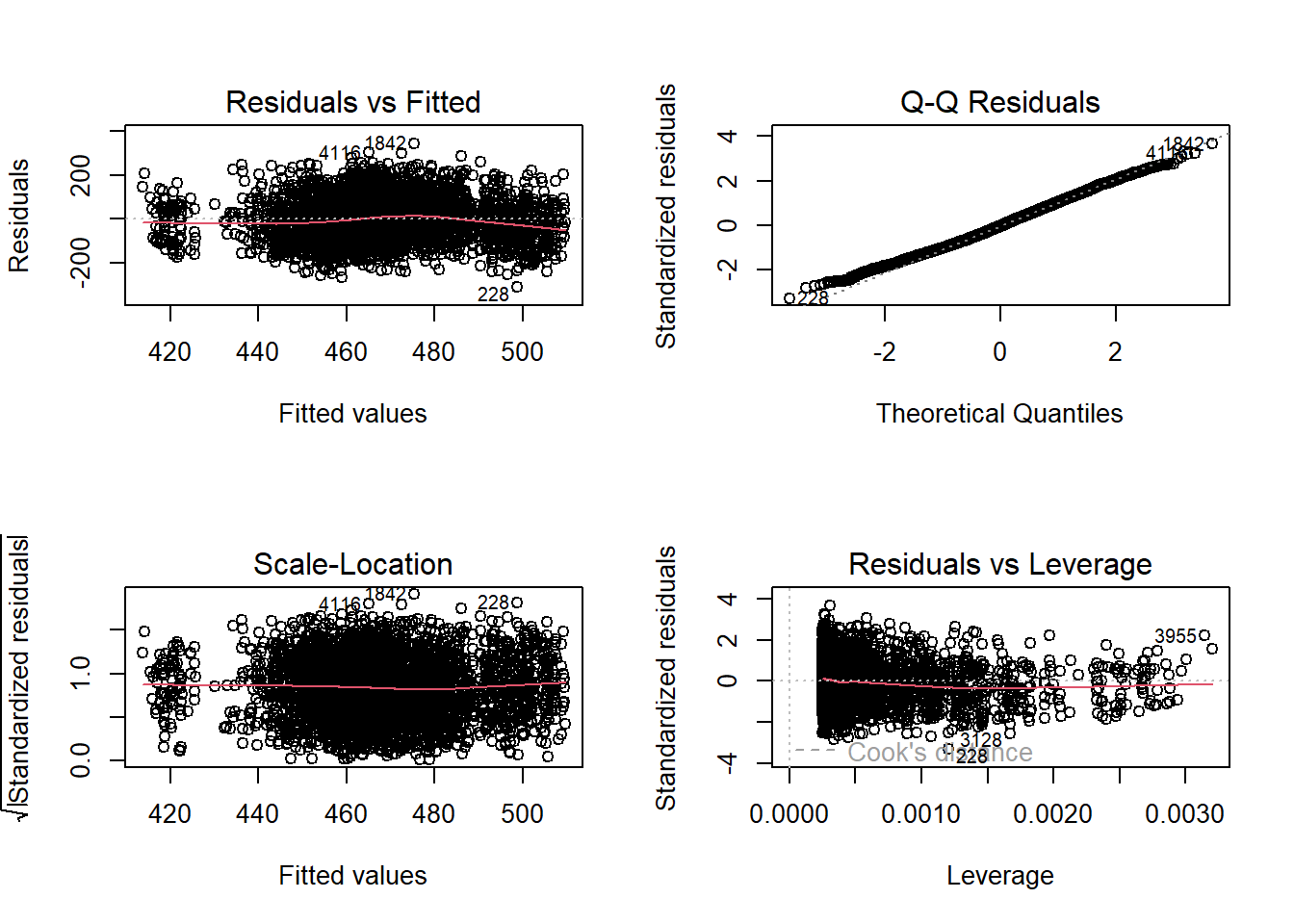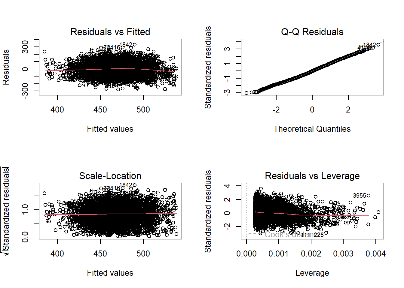 Overall, the model meets the assumptions of linearity, homoscedasticity, and normality of residuals, with no problematic outliers. The regression results can be interpreted with confidence.