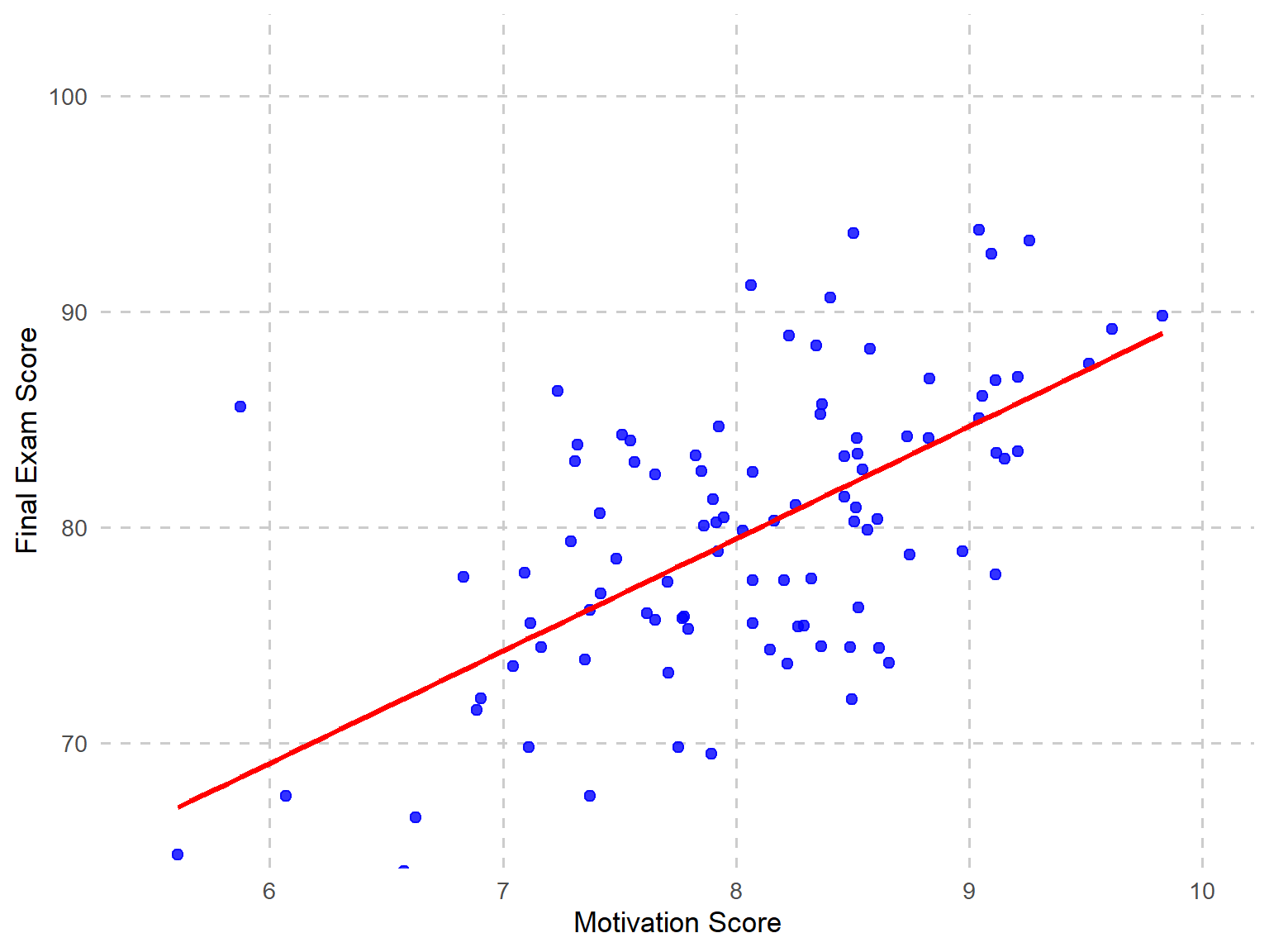 We collected data from 100 high school juniors enrolled in an Algebra II course. At the beginning of the semester, students completed a motivation assessment (scored from 1 to 10), which measured their self-discipline, interest in math, and effort toward learning. Students took a state-mandated final exam at the end of the semester, with scores recorded on a 0-100 scale. To investigate this, we will run a simple linear regression analysis where: