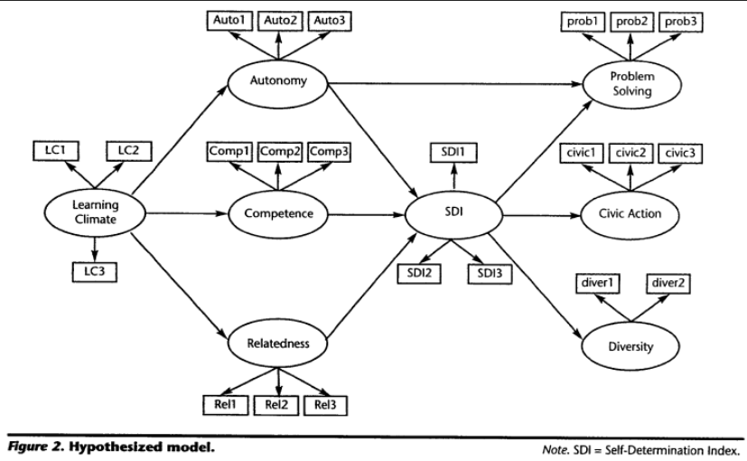 Figure 14.2 is from a study on self-determination theory by Levesque-Bristol et al (2011). Each oval is a latent construct that predicts answers to survey items, represented by rectangles. The authors expect that learning climate affects student motivation (SDI) through the mechanisms of autonomy, competence, and relatedness. Then they suggest that motivation leads to problem solving (which is also directly affected by autonomy), civic action, and diversity – and each of these constructs is represented by specific items (or groups of items).