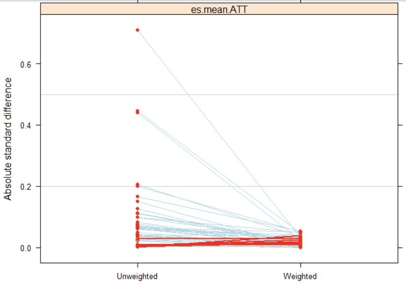 Figure 14.3 has a red dot for every variable included in a propensity model – everything the researcher thought would possibly predict propensity to use AP credit. The left side shows the standardized mean differences on those variables between treatment and control groups before weighting, and the right side is after weighting.