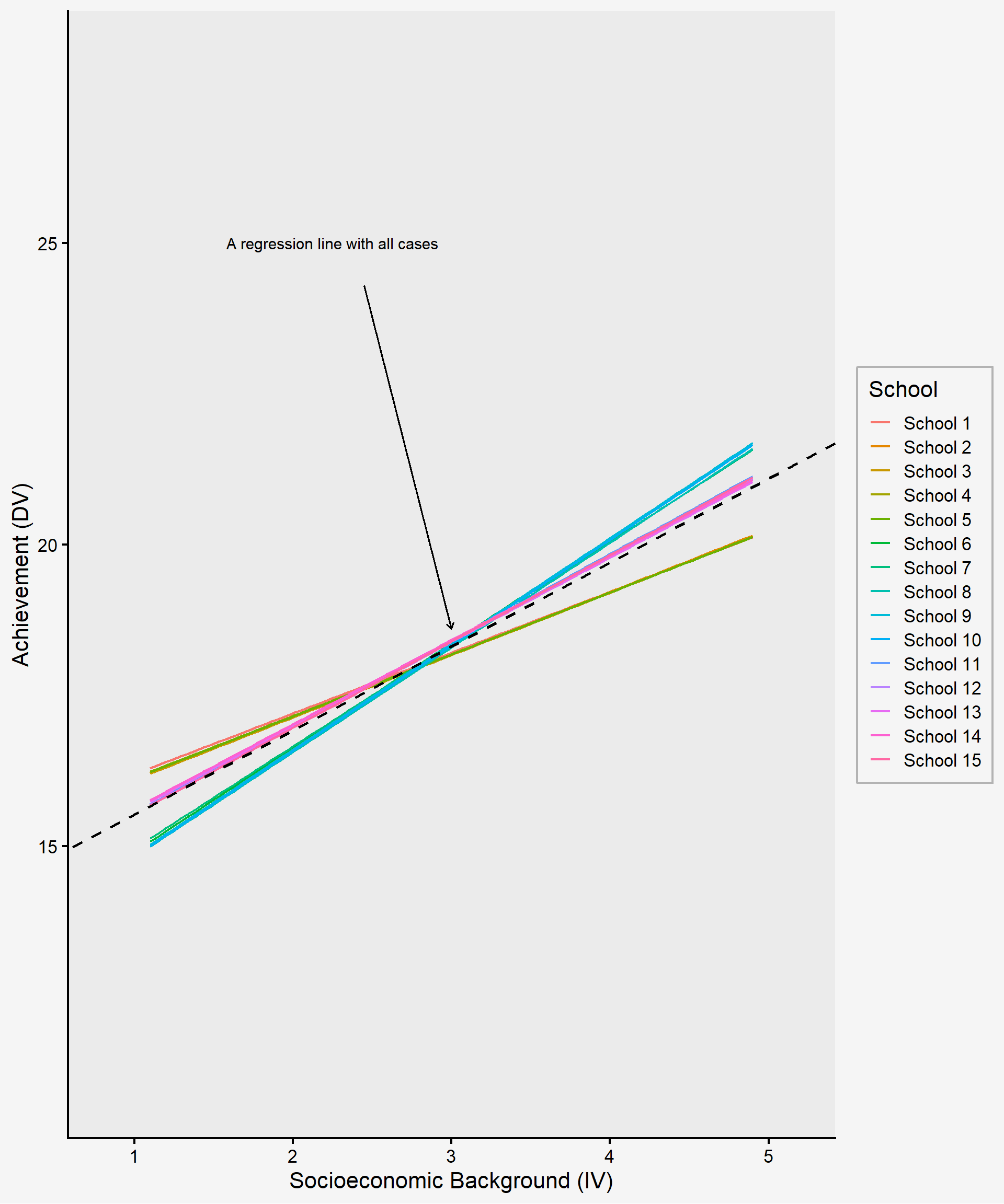 Exploration of group variation in the individual-level IV-DV relationship. For example, in a study across schools, each school might show a unique relationship between students’ socioeconomic background (the independent variable) and their achievement (the dependent variable). If you plot a line for each school, you might see that these slopes differ substantially across schools as shown in figure 14.1. In such a case, an analysis that ignores the nesting effect can oversimply our understanding of educational phenomena and may yield invalid results by ignoring the possible contextual impact in which students are embedded.