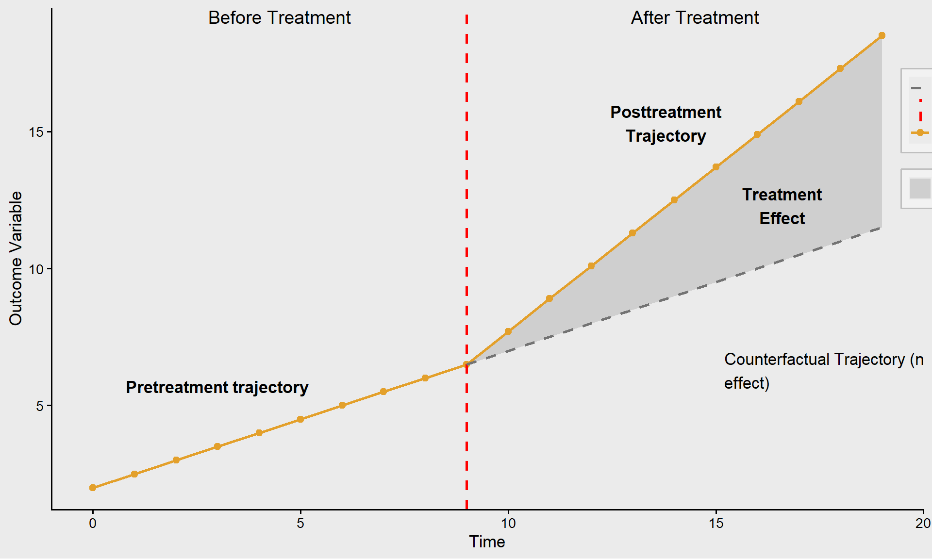 In most counterfactual frameworks, we must imagine what would happen to the same group of people in two different states or scenarios, one where they received the treatment and one where they did not. However, interrupted time series (ITS) provide a unique advantage because we can observe the same people across multiple points in time, both before and after our treatment of interest introduced. The key assumption in ITS is that the trend in the outcome variable would have remained the same if the treatment would not have occurred. In other words, we assume that any observed change in our outcome variable over time is due to the treatment effect.
