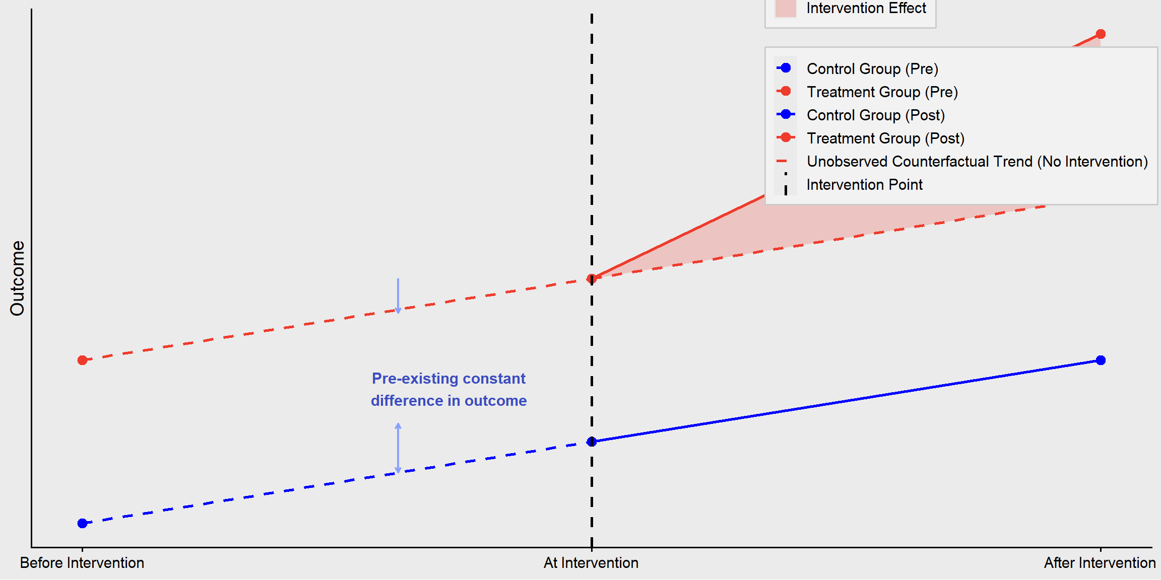 Difference-in-Differences (DiD) is a quasi-experimental research design used to estimate the causal effect of an intervention or policy by comparing the changes in outcomes over time between a treatment group and a control group. It helps control for time-invariant confounders that could affect both groups equally. This concept is similar to the interrupted time series (ITS) method, except we are looking at treatment groups versus individuals. The first difference is the difference you observe in the treatment group before and after the intervention. The second difference is the gap between the control group and the counterfactual for the treatment group.