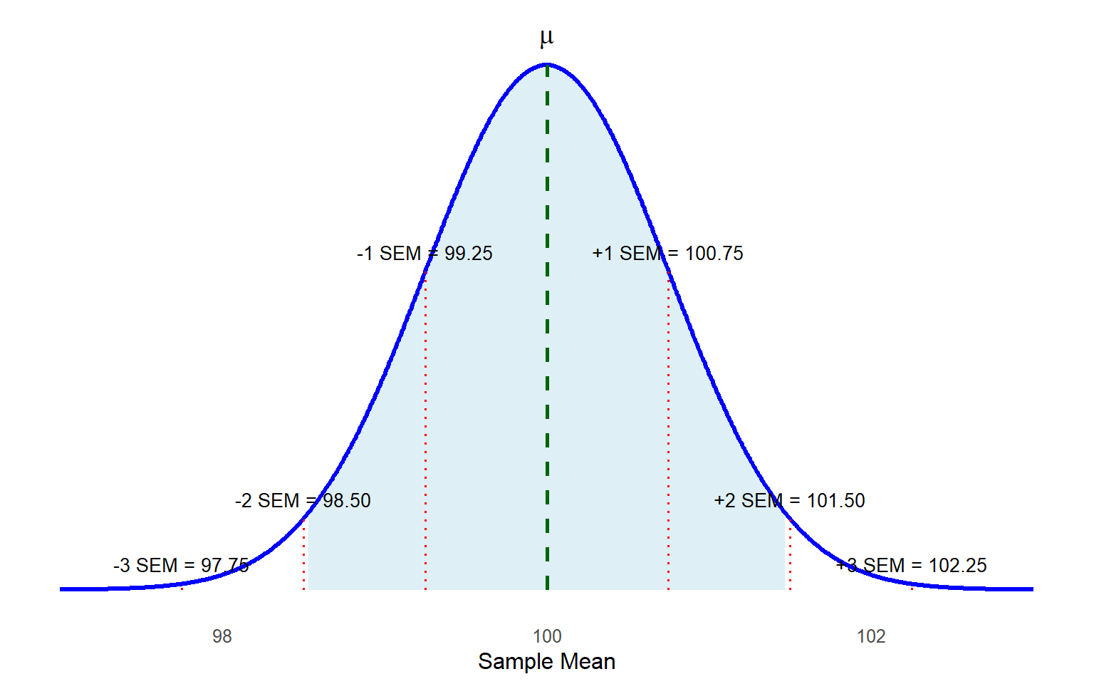 Before we move to step 2, think about what the sampling distribution of sample means would look like for this scenario. We know the population mean (100) and standard deviation (15) in this case. Thus, we know the sampling distribution would be centered at μ = 100 and that the standard error would be: